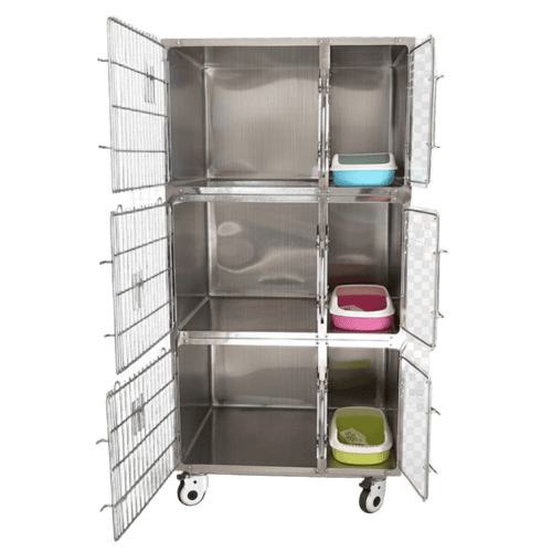 Overall 304 stainless steel material, anti-corrosion, acid-proof and rust-free, cage material thickness of 1.2mm, cage door with a diameter of 8mm and 6mm steel wire composition, the middle partition and cat jumping board made of high-strength acrylic board. The bottom moving wheel is made of high strength medical universal brake wheel.